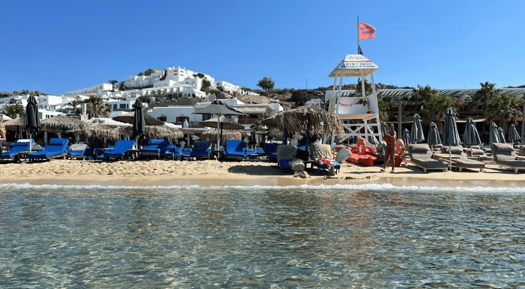 This beach has soft sand for the kids to play in! There is rocky sand where the chairs are, but the sand by the water and in the water is soft and feels so nice under your feet. Every section of this beach is occupied by hotels and restaurants. We were warned about DK Oysters not posting prices and ripping people off. So we stayed away from those beach beds. We went next door to Yialo Yialo and we were VERY happy. The staff were very nice and accommodating. They have free WiFi as well. The food was good. Try the dips! My kids liked the pizza. We have been to 6 other Mykonian beaches- this one had the best sand, hands down!